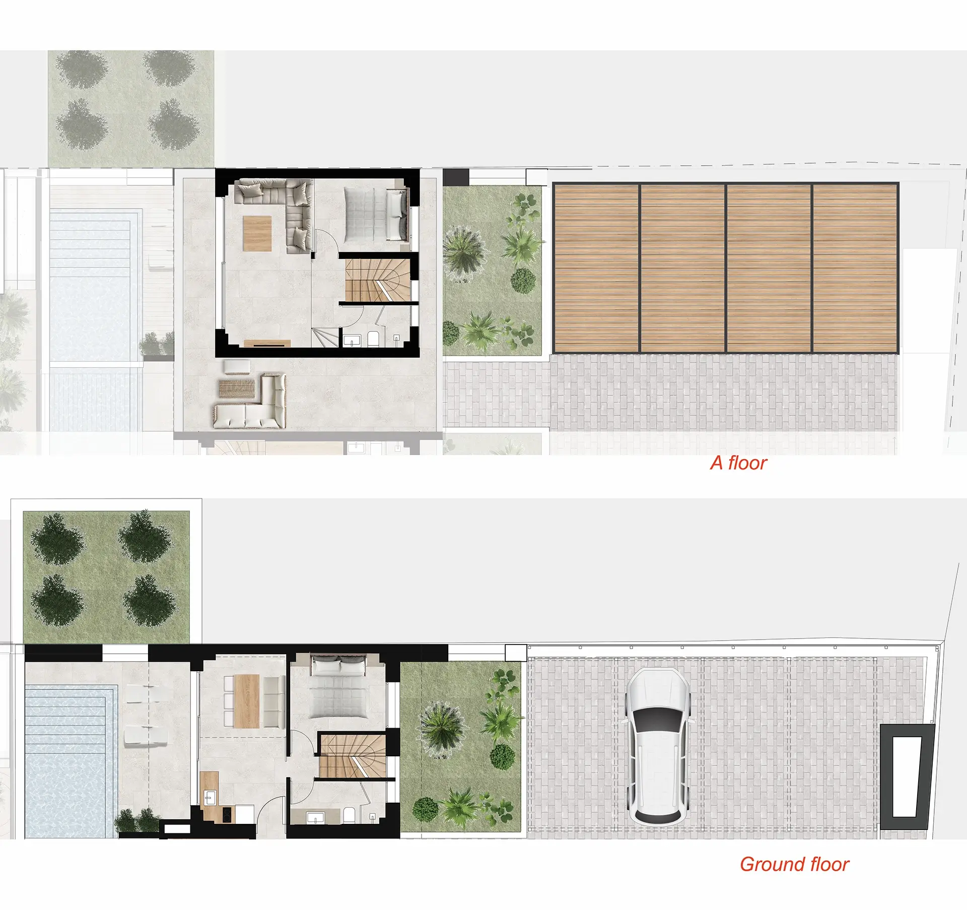 Stepping into the ground floor of the villa, you will find an open plan space, featuring the kitchen (with oven + cook top, refrigerator, dishwasher, microwave) and dining areas with a large, wall-mounted smart TV, as well as a sofa. The living room opens into a small private outdoor patio overlooking manicured olive trees with lounges and an infinity pool (13 sq. m.).