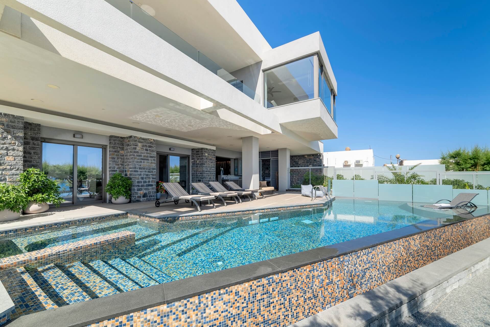 With full privacy and no direct neighbors, this 420 sq meter stunning beachfront villa is perfect for events, celebrations, retreats and weddings. Its unique design is ideal for an intergenerational family holiday, as it allows autonomy while mutually benefiting from proximity. Galilean Moons Villa can accommodate 19 guests comfortably, and up to 27 guests if needed, in its 10 bedrooms.